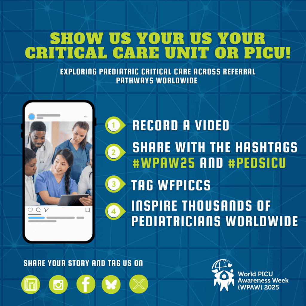 世界儿童重症监护室宣传周委员会旨在通过在全球和区域层面开展宣传和倡导活动,提高人们对#儿童重症监护的整体认识以及影响该专业的重要主题。这为期 7 天的活动将在每年 5 月第二个星期五的世界儿童重症监护室宣传日达到高潮。