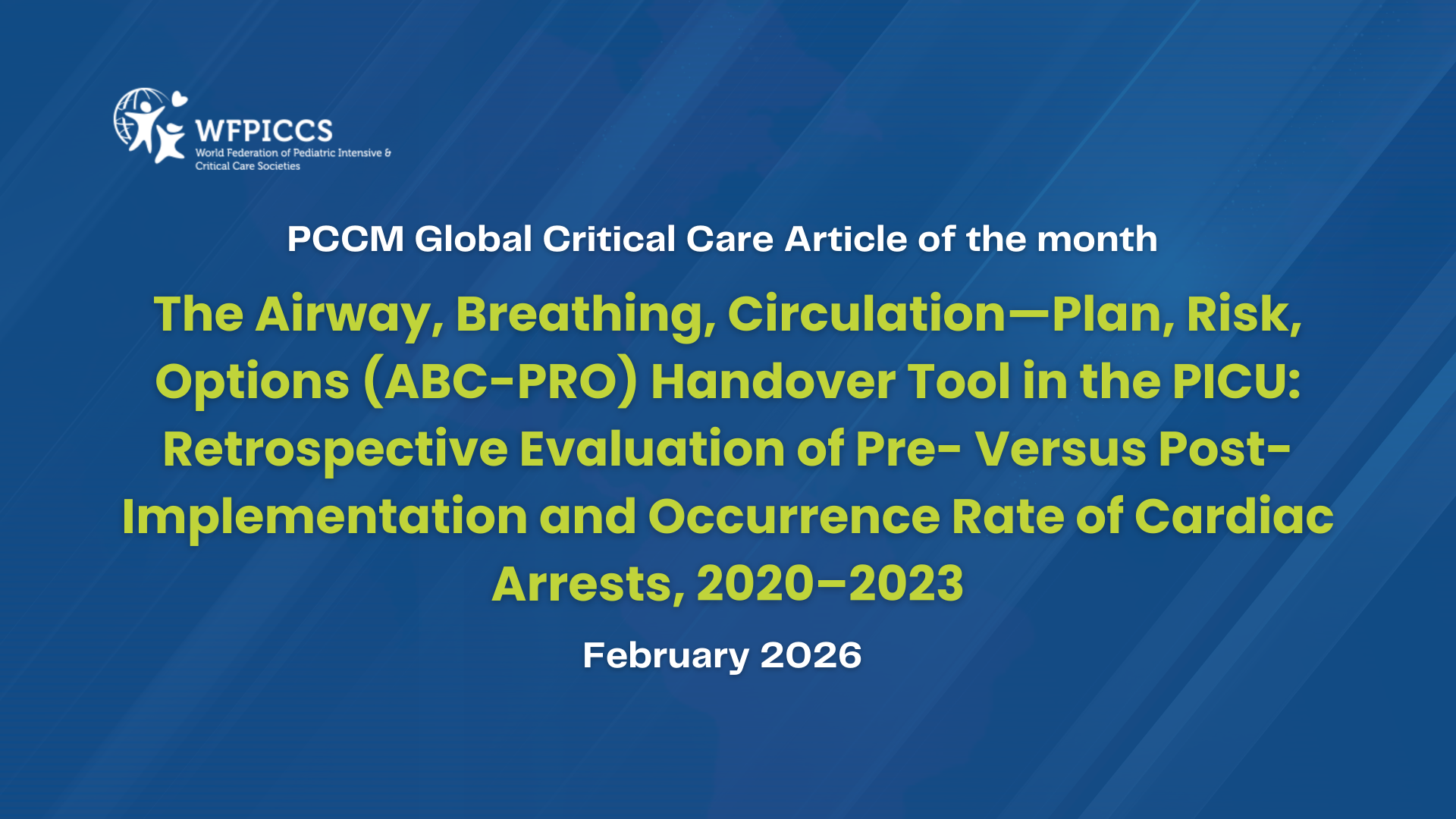 The selected Article for February 2026 is The Airway, Breathing, Circulation—Plan, Risk, Options (ABC-PRO) Handover Tool in the PICU: Retrospective Evaluation of Pre- Versus Post-Implementation and Occurrence Rate of Cardiac Arrests, 2020–2023